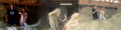 Urakoitsijat rehunteossa isännän apuna.
